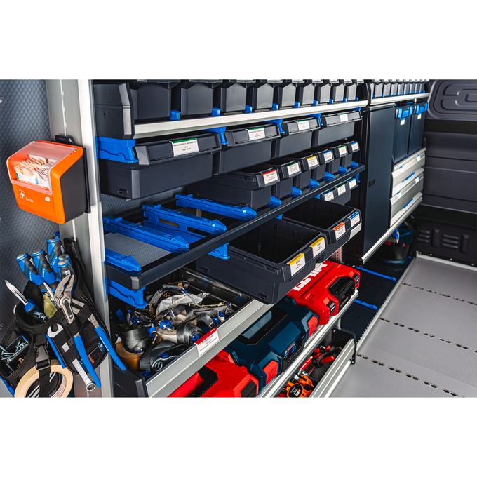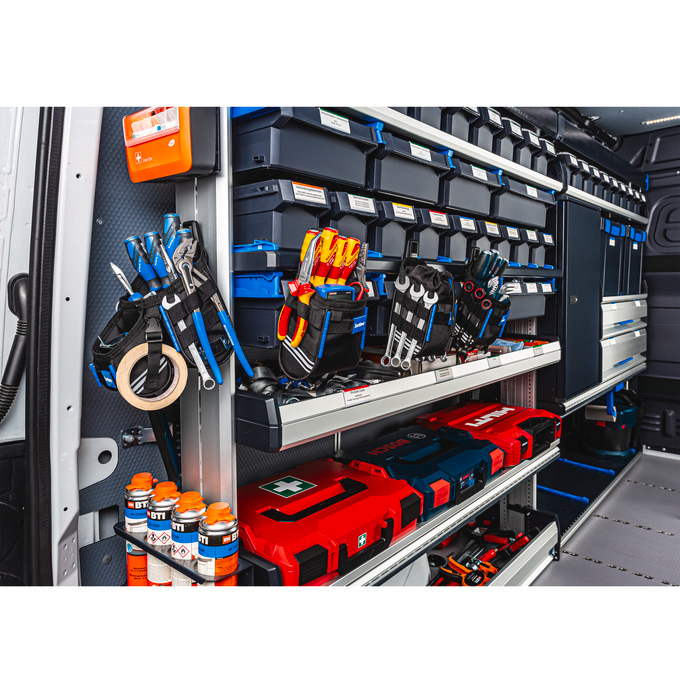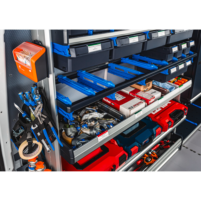 Der BOXXenrahmen ist durch seinen signifikanten Preis- und Gewichtsvorteil eine smarte Alternative zum Fachboden, wenn es um die Integration von BOXXen in SR5 geht. Seine maximalen Vorteile kann der BOXXenrahmen bei einer BOXXenbestückung auf Ober- und Unterseite ausspielen. Die Ober- bzw. Unterseite des Rahmens lassen sich dabei unabhängig voneinander mit Auszugschienen ausstatten, was maximale Flexibilität bei der Konfiguration ermöglicht. Durch die integrierten ProClick-Schnittstellen bietet der BOXXenrahmen zusätzlichen Mehrwert. Hier lassen sich komfortabel und griffbereit die ProClick Werkzeugtaschen mit verstauen. (Abbildungen ähnlich, Dekomaterial nicht enthalten; Lieferung nur innerhalb Deutschlands)