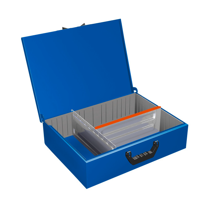 Der Metallkoffer 321 verfügt bereits über zwei Schlitztrennbleche, sodass Sie das Trennblech 262×62 mm nur noch über die beiliegenden Kunststoffadapter an beliebiger Position einstecken müssen, um weitere Unterteilungen in der Tiefe zu schaffen.