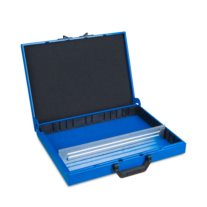 Mit dem Trennblech können Sie Ihren Metallkoffer 320 in der kompletten Tiefe unterteilen, indem Sie es in die serienmäßig vorhandenen seitlichen Führungsschienen des Metallkoffers einschieben.