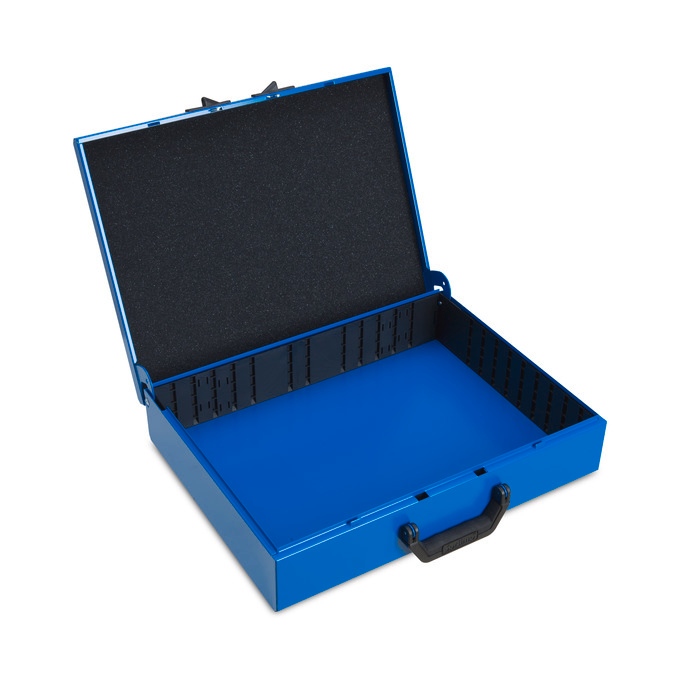Der Trennblech-Einsatz 330 ermöglicht die Unterteilung des Metallkoffers KM 330 mit Schlitztrennblechen und Trennblechen. Die so entstehende Teilbereiche sorgen für Ordnung und Übersichtlichkeit innerhalb des Metallkoffers.