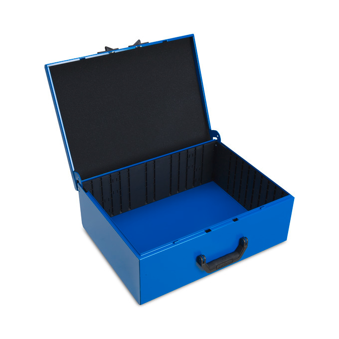 Der Trennblech-Einsatz 350 ermöglicht die Unterteilung des Metallkoffers 350 mit Schlitztrennblechen und Trennblechen. Die so entstehende Teilbereiche sorgen für Ordnung und Übersichtlichkeit innerhalb des Metallkoffers.